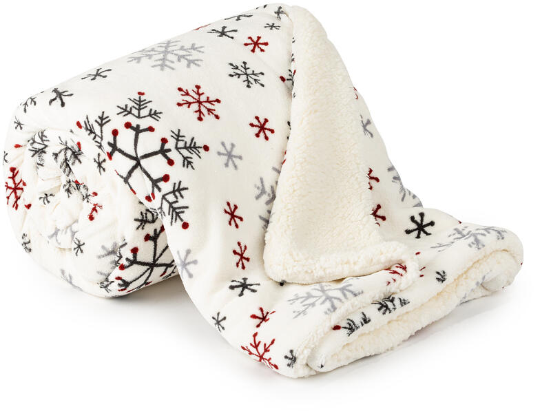 A 4Home márka Snowflakes gyapjú hatású plédje téli hangulatot varázsol otthonába. A fehér alapon elszórt piros és szürke hópelyhek elegáns téli motívumot alkotnak , amely minden belső teret felvidít. A pléd finom és tiszta hatást kelt, így modern és klasszikus környezetbe is remekül illeszkedik. Az egyik oldala puha mikroplysből készült, diszkrét fényességgel, a másik oldala pedig puha fehér gyapjú hatású anyag, amely arra csábít, hogy bebújjunk alá és pihenjünk.