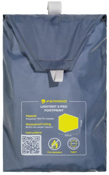 A Lightent 3 Pro footprint Ferrino talajtakaró sátorhoz újrahasznosított poliészterből készült, kivitele ellenáll az égésnek, csökkenti a mechanikai sérüléseket, miközben növeli a vízszigetelést. A Ferrino márkájú Lightent 3 Pro footprint talajtakaró sátorhoz ideális választás a sátor vízszigetelésének fokozására, véd a mechanikai sérülésekkel és a szennyeződésekkel szemben. A talajtakaró a külső sátorral kombinálva is használható (a belső sátor használata nélkül), így a sátor súlya mindössze 1,8kg-ra csökken. A talajtakaró újrahasznosított poliészterből készült, poliuretán bevonattal, tűzgátló bevonattal és 8000 mm-es vízoszloppal büszkélkedhet.