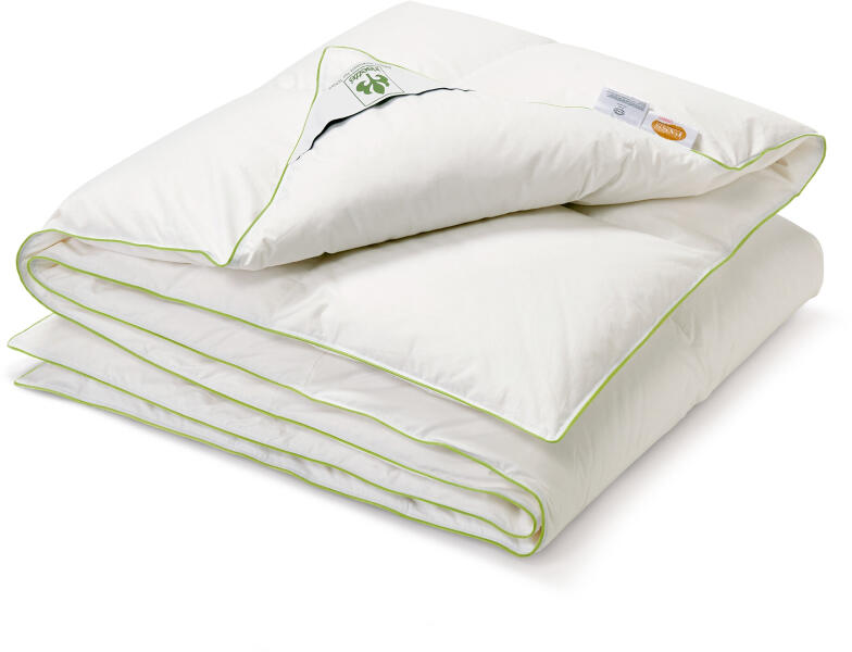 irisette® átmeneti pehelypaplan, normál méret Szín: Fehér, zöld paszpóllal Anyag: Huzat: 100% pamut (ökológiai gazdálkodásból) Töltet: 90% pehely, 10% toll (állati eredetű, nem textil alkotórészeket tartalmaz) Méretek: Kb. 140 x 200 cm Súly: Kb. 640 g Tájékoztató allergénekről: Porallergiások számára alkalmas Fehér pehellyel és tollal töltött a DIN EN 12934 szerintRendkívül puha és puffosA kazettás steppelésnek köszönhetően nem csúszik el a töltetMosógépben tisztítható és szárítógépben szárítható NOMITE® atka elleni védelem – allergiások számára ideális2-es melegségi osztály: egész évben használható paplan közepes melegségi fokkalirisette®: kizárólag a Tchibo számára kifejlesztett