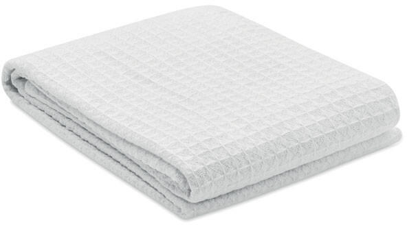 300 g/m2 könnyű pamut waffle (jellegzetes négyzetrácsos szövésű) takaró. Fehér kartondobozban szállítjuk.