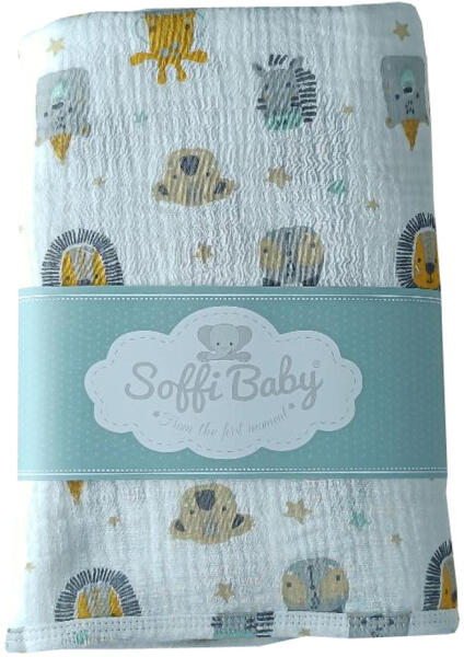 Soffi Baby kétrétegű muszlin takaró ultra puha, könnyű mintás anyagból. Ideális otthon és úton egyaránt. - ideális otthon és úton egyaránt. - kétrétegű muszlin takaró. - könnyű és puha. Újszülött kortól ajánlott. Mérete: 70x90cm Anyagösszetétel: 100% pamut