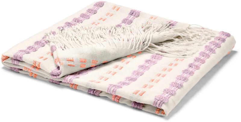 Takaró Szín: Bézs, barack, orgonalila Anyag: 52% poliészter, 48% poliakril Méretek: Kb. 130 x 170 cm Rojtokkal a rövidebbik oldalainFinom, puha és melegSokoldalúan használható: stílusos takaróként az ágyon vagy a heverőn, a fotelen és társaikon