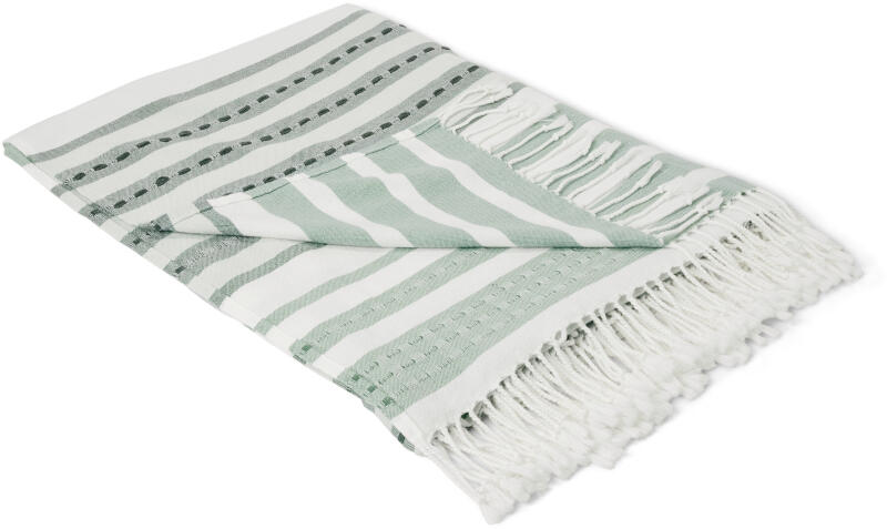 Takaró, rojtos, csíkos, 155x200 cm Szín: Fehér-világoszöld-sötétzöld csíkos Anyag: 100% pamut (támogatja a Cotton made in Africa kezdeményezést) Méretek: Kb. 155 x 200 cm Igényes szövésűRojtokkal a rövidebbik oldalain Puha és bársonyosTámogatja a Cotton made in Africa kezdeményezéstEz a takaró támogatja a termelőket.