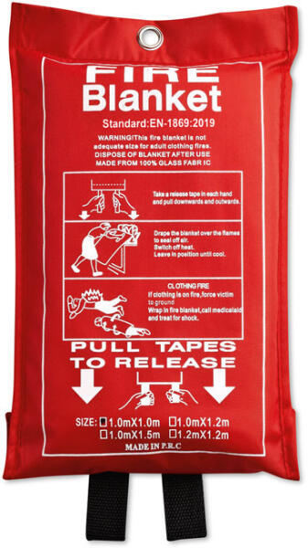 Üvegszálas tűzoltó takaró PVC tokban. Méretek: 95x100 cm.